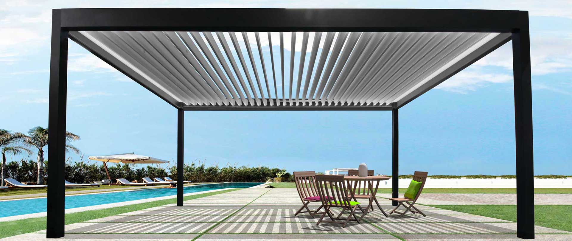 La pérgola bioclimática DG220 con lamas orientables de 200 mm de ancho, consiste en un sistema de cubiertas para terrazas, con numerosas posibilidades para adaptarse a cualquier situación.