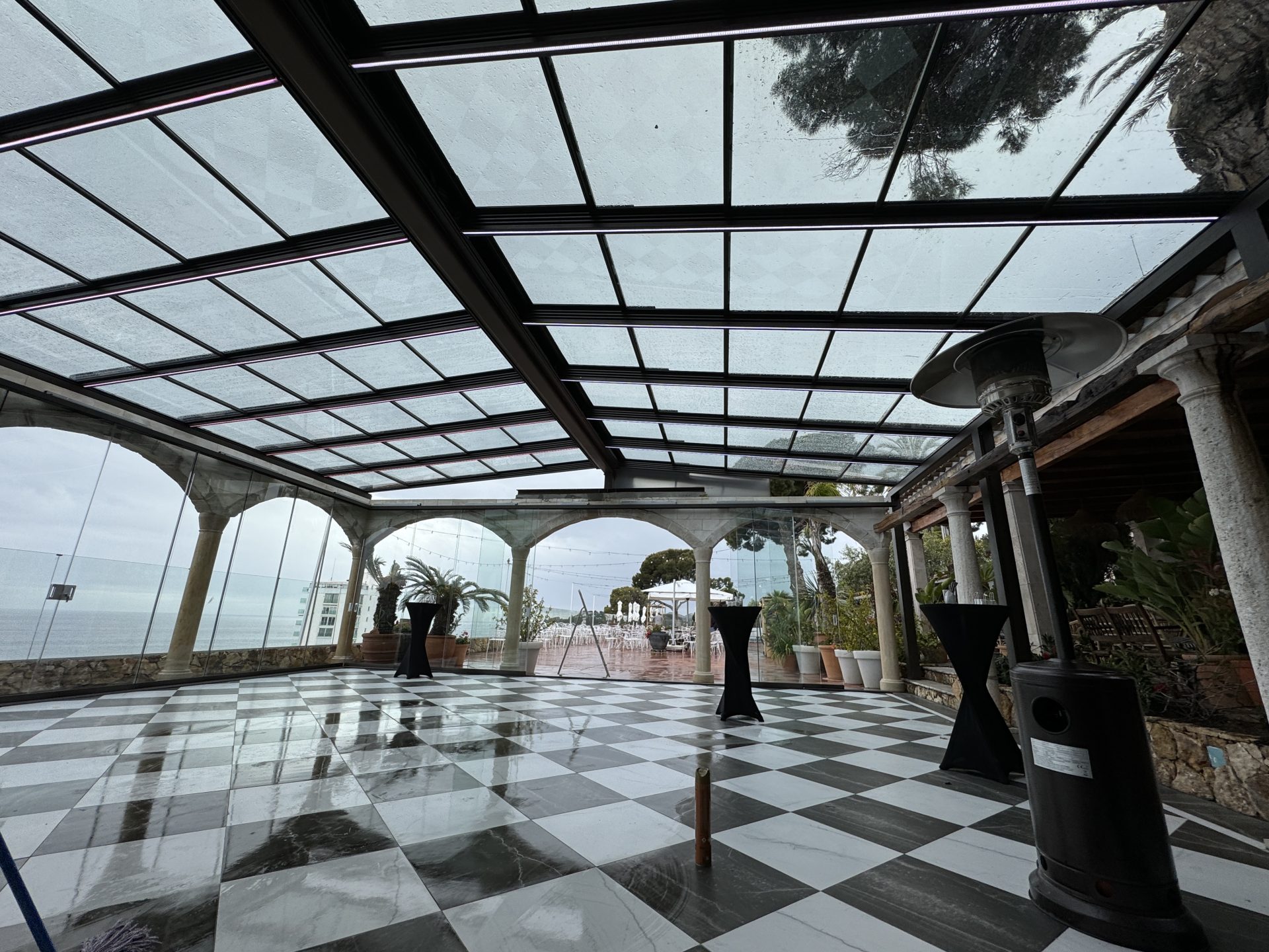 Instalación de cortinas de cristal en un restaurante en plena plaza céntrica de Barcelona. Una solución elegante que permite aprovechar al máximo las vistas urbanas, proporcionando un ambiente único y cómodo, tanto en invierno como en verano.