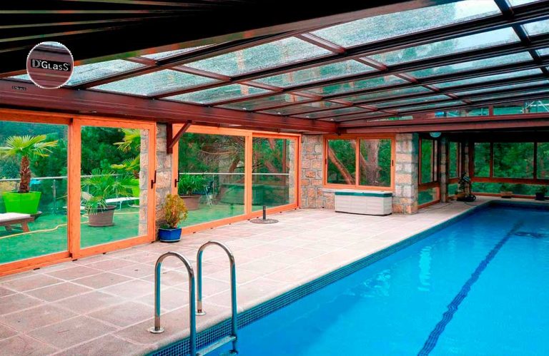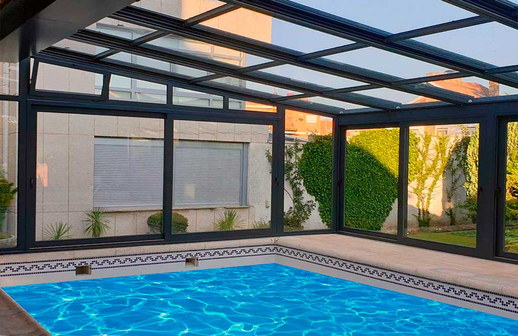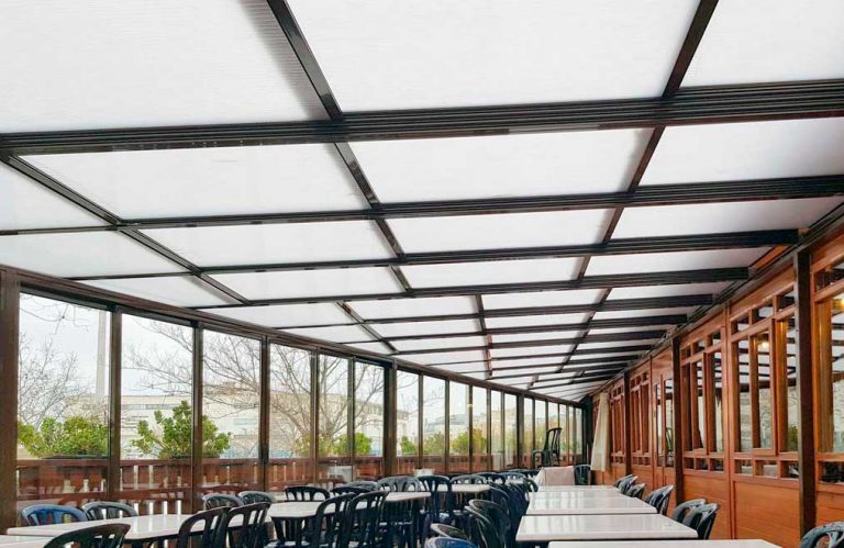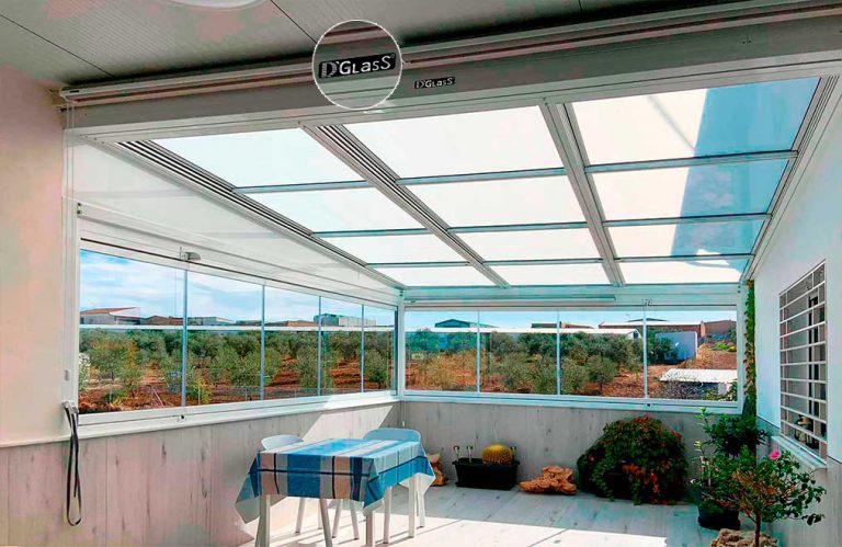 El techo móvil motorizado DG26 está diseñado para espacios de grandes dimensiones, con una estructura robusta y compacta, sin renunciar a la elegancia, con perfiles de líneas suaves que incluyen canalización para recogida de aguas de lluvia llevándola hasta el suelo.