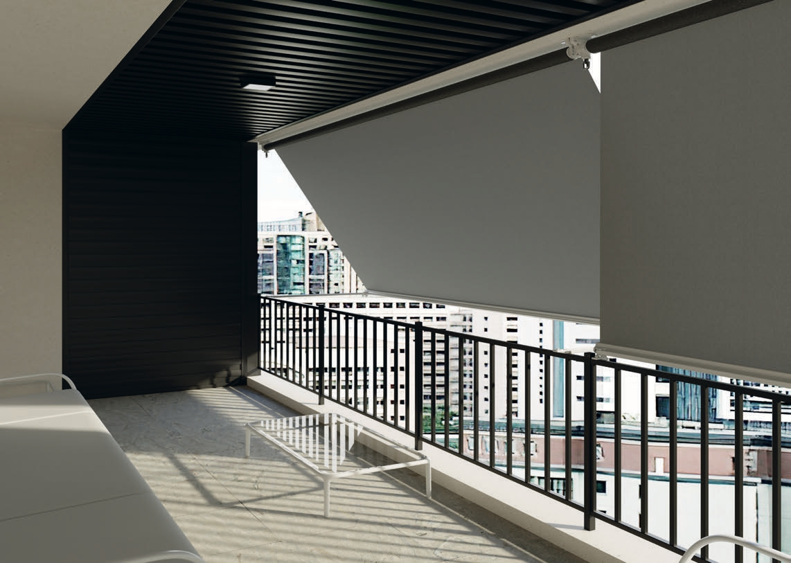 Toldo Balcón 1020: versátil y elegante, con doble posición tipo telón o salida. Resistente, personalizable y motorizable, ideal para sombra y privacidad en balcones.